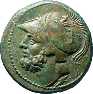 Vorderseite: Helmeted and bearded head of Ares l.; below thunderbolt; all within dotted border.